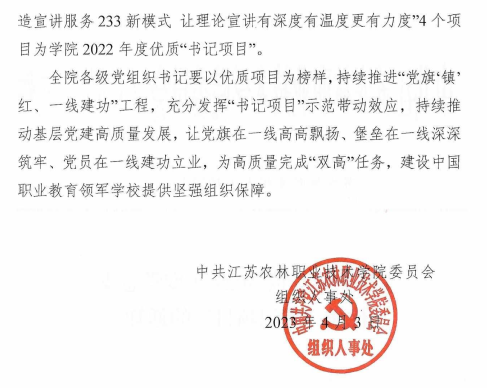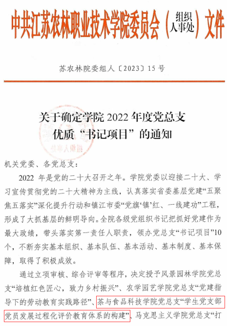 近日,中共江苏农林职业技术学院委员会组织人事处发文《关于确定学院2022年度党总支优质“书记项目”的通知》(苏农林院委组人[2023]15号),我院党总支“书记项目”——“学生党支部党员发展过程化评价教育体系的构建”被授予学院2022年度优质“书记项目”。